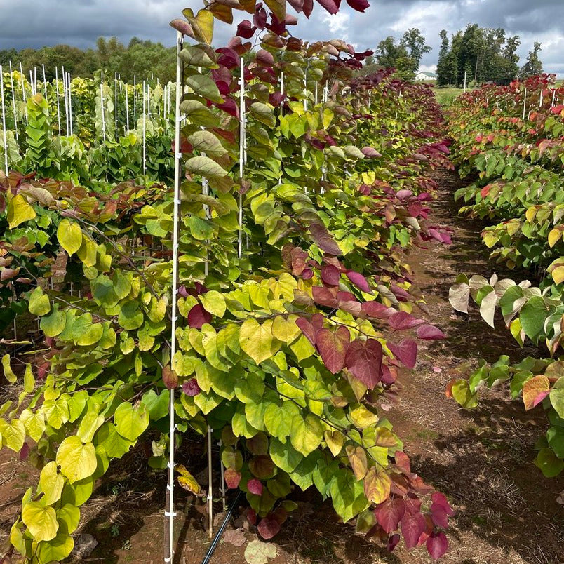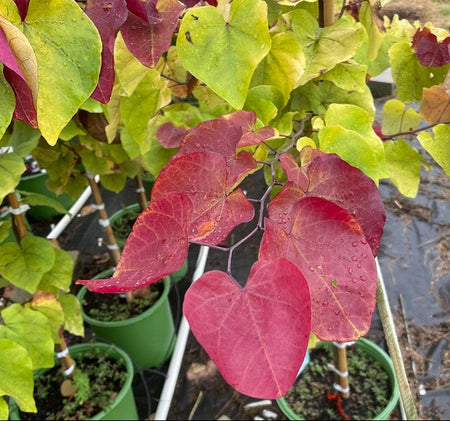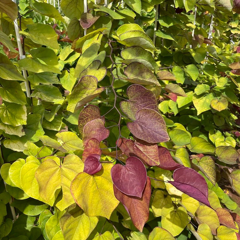 Introduced in 2020, this tree is spectacular! A brand new introduction from the JC Raulston Arboretum a NC State University, this is your opportunity to add a unique and rare tree to your personal garden or yard. A cross between the burgundy colored and golden redbuds, the Flame Thrower® displays up to five colors (burgundy, red, orange, yellow, lime) of foliage on each branch. The size of the Flamethrower is similar to that of the rising sun, keeping it small, topping out at 15 to 20 feet high and 15 feet wide. Like most other redbuds, it is a low maintenance tree and can tolerate full sun with minimal leaf scorch, but does best in morning or afternoon sun.