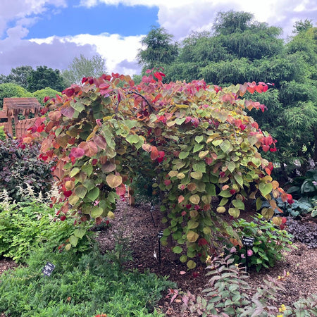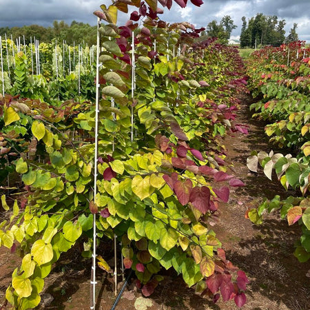 The Flame Thrower Redbud is similar to the rising sun, but larger in stature meaning that it is more useful as a single specimen in a garden bed or yard and that the canopy or structures will play more of a role in selecting a planting location. With it's multitude of bright yellows, reds, and oranges, the flame thrower pairs well with the solid deep greens of hostas, perennials, boxwood, grasses and ferns when in a garden bed, or as a single tree with natural dark brown mulch and elements of hardscaping. Given that it is even more audacious than the Rising Sun, we recommend pairing with companion plants that bring in greens and other neutral colors, which frame the flame thrower in the landscape. The Flame Thrower is a native cultivar, and pairs well with other native perennials when the goal is a native North American garden.