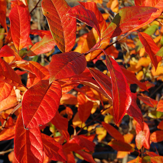The Wildfire Black Gum or Tupelo tree is a personal favorite shade tree. That's why I have one shading the southwest side of my home from the sun. But really, what's not to love? These nativars are hardy, easy to care for, maintain a consistent shape and provide stunning multi-season fire-red foliage. In the spring the first leaves of this tree emerge a brilliant fire-wagon red, which are beautiful on their own, but can providing a stunning backdrop for other specimen trees like dogwoods or redbuds. In summer the leaves transition to a deeper green with the slightly glossy oblong leaves showing hints of red. The bark of a younger tree is smooth almost like a cherry and gets rougher with age. In fall, The black gum often holds out a little later for its show, but when transitions you can't mistake it. Leaves change from green/orange quickly to red with mottled darker red splotches that make it deeper in color, but simultaneously more brilliant than many of the maple cultivars.