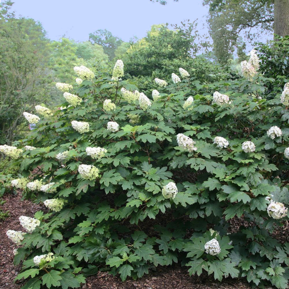 Alice Oakleaf Hydrangea is among the largest of the oakleaf hydrangea cultivars. Coming in at 12-15 ft. wide and 8-10 feet tall a mature Alice hydrangea is a sight to behold. very large conical flowers drape this hydrangea mid-summer through fall. Due to its large size it is very well suited for border plantings and natural screening.