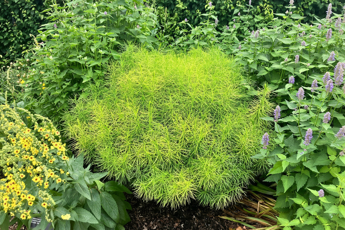 Amsonia is a low-maintenance drought-resistant native that brings some extraordinary features to the table. In spring fluffy and airy feeling light green foliage emerges growing in a uniform clump, which transitions to a darker green as the growing season wears on. In late spring, early summer, clumps of periwinkle blue flowers spring from the top portions of the foliage creating a blanket of pollinator friendly blue flowers. As the flowers fade and fall approaches, String theory changes from deep green to a distinct and gorgeous golden yellow orange that makes it appear almost like a living flame in your landscape.