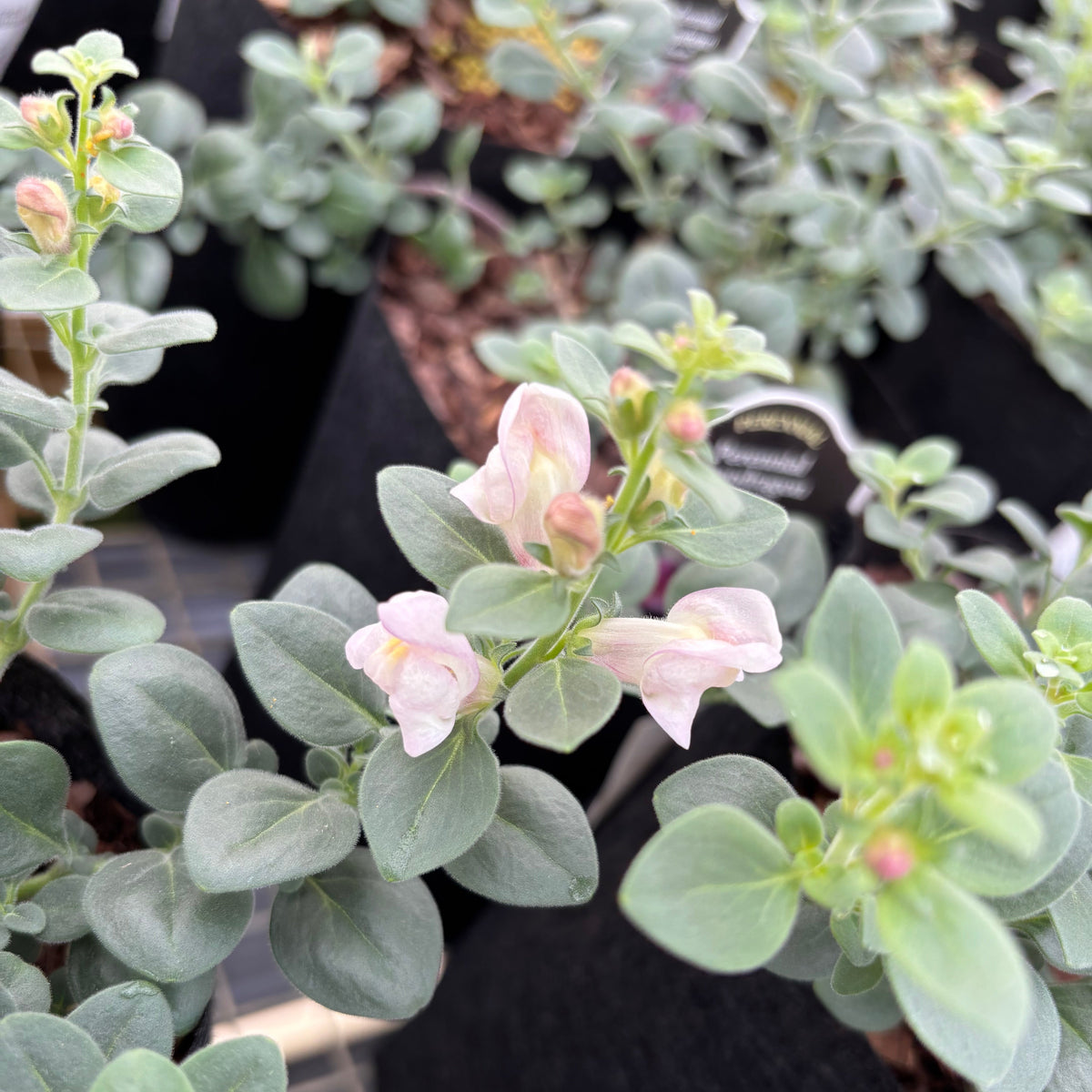 From late spring through fall, the plant produces delicate pale pink snapdragon-shaped flowers with a characteristic pale yellow dot on the lower lip. The blooms appear on spikes rising above the foliage and maintain their display throughout the summer months, providing long-lasting color and attracting bees, butterflies, and other beneficial pollinators to the garden.