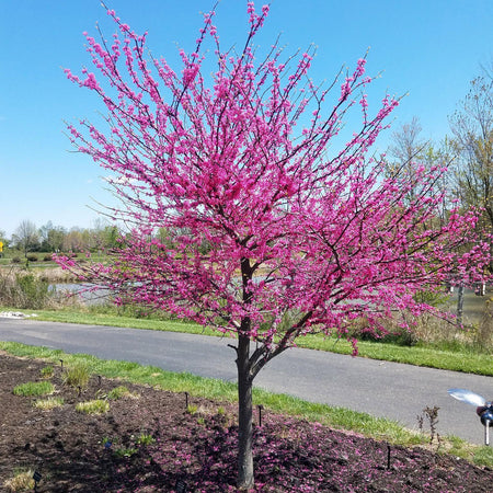Redbuds do prefer some shade, afternoon shade is best as morning sun decreases problems with powdery mildew, but most cultivars will grow in full sun without issue. They will not tolerate a site with standing water and prefer well-drained soil rich in organic matter. Soil composition is less important with redbuds than compaction, which happens from heavy equipment, vehicle traffic, mower traffic or even lots of foot traffic. Compacted soil is hard and lacks the natural sponge like structure that redbuds need to grow. A good rule of thumb is that if grass is struggling in an area then redbuds will too. Speaking of grass, grass should be removed in a 2-3 ft. radius around the redbud. Wood mulch should be applied and must be applied to qualify for a refund. Rock leads to extra heating and is as likely to damage your tree as protect it. Finally, redbuds can grow in costal areas, but the salts near the ocean will cause growth issues. They should not be grown south of the Florida pan handle unless your micro-climate specifically sustains existing populations of the tree.