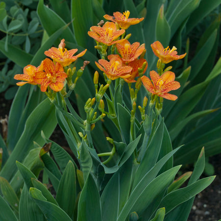 Belamcanda chinensis 'Freckle Face' delivers a knockout punch of color when you need it most in late summer. This Walters Gardens introduction produces abundant two-inch starry blooms in brilliant tangerine-orange, each petal playfully speckled with deep red freckles that give this cultivar its charming name. The flowers open in succession for weeks atop compact eighteen to twenty-four inch plants with handsome sword-shaped foliage that resembles bearded iris. What sets 'Freckle Face' apart is its remarkable second act: after the blooms fade, decorative tan seed pods split open to reveal clusters of glossy black seeds that look exactly like blackberries, persisting through winter to provide months of additional interest. This compact selection outperforms the pale species form and brings exotic flair to any sunny garden without demanding fussy care in return.