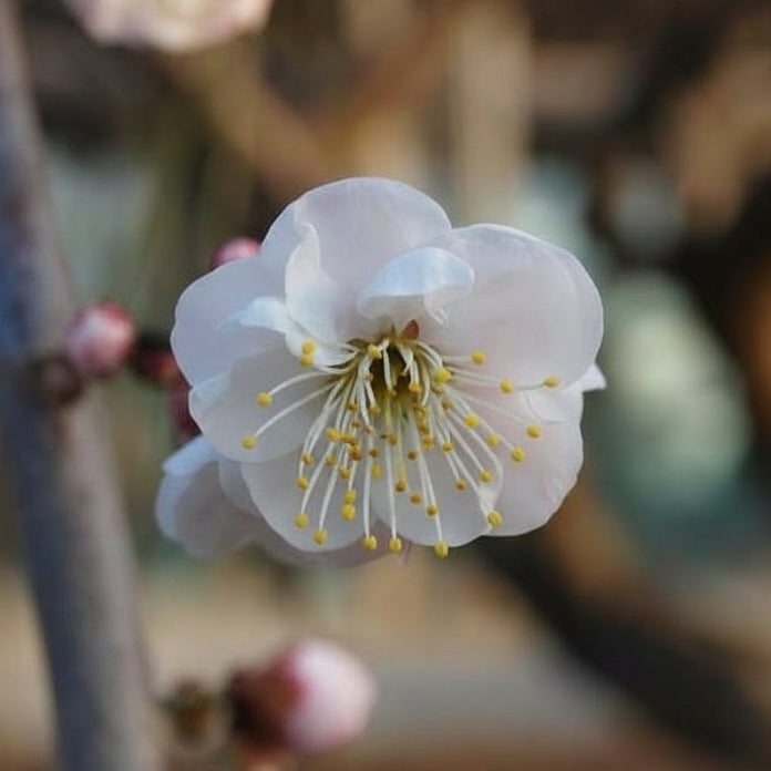 Like an elegant dancer taking a bow, 'Bridal Veil' brings graceful drama to the winter landscape with its distinctly weeping form—a refreshing departure from the typically upright or rounded Japanese apricots. This vigorous deciduous tree reaches approximately 10 feet in height while spreading an impressive 20 feet, creating a broad, cascading canopy that lives up to its romantic name. The branches arch downward in gentle, flowing lines rather than the dramatic plunge of a true weeper, creating what nursery professionals poetically describe as "gently down-arching branches." In late winter, typically January through March, these sweeping branches become draped in very pale pink to white single flowers, each bloom measuring 1 to 1.25 inches across with five delicate petals. The flowers are strongly scented, and following the fragrance pattern of pale-flowered Prunus mume cultivars, 'Bridal Veil' produces a sweet, fruity perfume rather than the cinnamon spice notes characteristic of darker pink and red varieties.