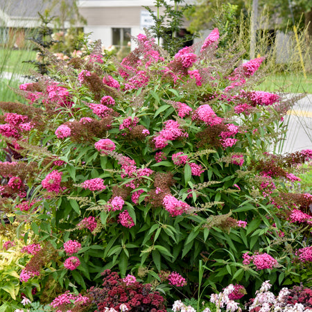This medium sized butterfly bush has dazzling huge pink blooms. It's an excellent choice for a shrub-like plant that will add beautiful bubble gum pink blooms to your yard. Coming in at 4 feet tall and wide, it is useful in a range of situations where you might use other less showy and colorful shrubs. Cherry Royale is a nice sized shrub for the back of a border garden or a foundation planting where you want some serious color. We think these are perfect shrubs for those looking for a hydrangea alternative in a location with full sun. Foliage is a minty green and wispy providing a nice layering effect to the shrub and a perfect backdrop for other flowers before the blooms emerge in late summer.