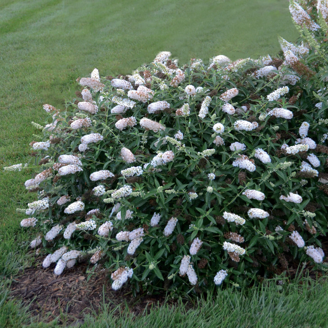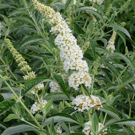 We were attracted to this buddleia because it is compact and saves space, but it's literally covered in huge 10 to 12 inch panicles of pure white blooms. The bush itself keeps a compact gumdrop like shape through the year with very attractive silver green foliage. Although the best blooming power is in its initial bloom in mid to late summer, secondary blooms will extend the flowering season.
