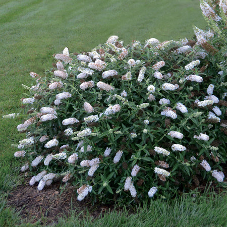 The Humdinger® collection consists of compact bushes that pack the maximum punch. They bloom weeks earlier than most other buddleia and maximize blooms over a small area. This small to medium sized upright selection of butterfly bush is sure to capture the hearts of pollinators and plant enthusiasts everywhere. The butterfly bush is a staple of many gardens due to its fast growth rate, hardiness, and prolific blooms. Arriving in late summer, the bottle shaped blooms of this buddleia are 10-12 inches in length and a crisp white that pull in hints of blue and lavender depending on the light. They are sure to be a heavenly presence in your garden. Butterly bushes are named such because they are a bounty for pollinators attracting hummingbirds, bees, butterflies and other pollinators to their sweet-scented blooms.