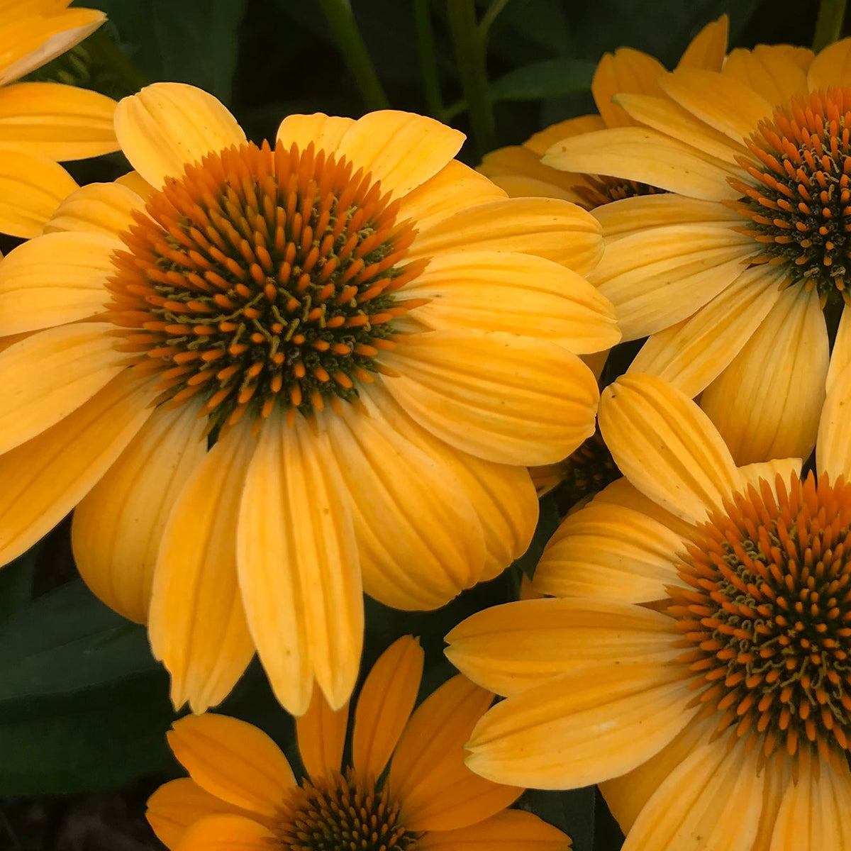 The flowers of 'Sombrero Granada Gold' are particularly noteworthy for their depth of color and structural beauty. Each bloom features overlapping petals in a deep golden-yellow shade that radiates warmth and intensity, creating a more saturated golden tone compared to other yellow coneflowers in the marketplace. These ray petals form a generous skirt around prominent copper to deep golden central cones that stand boldly upright, maintaining their architectural presence throughout the flowering season. The blooms measure generously across and are produced in remarkable abundance, creating such a profuse floral display that the deep green foliage nearly disappears beneath the blanket of color. Unlike some golden coneflowers that fade to pale yellows as summer progresses, this cultivar maintains its brilliant color intensity from the first flush of bloom through the final flowers of the season.