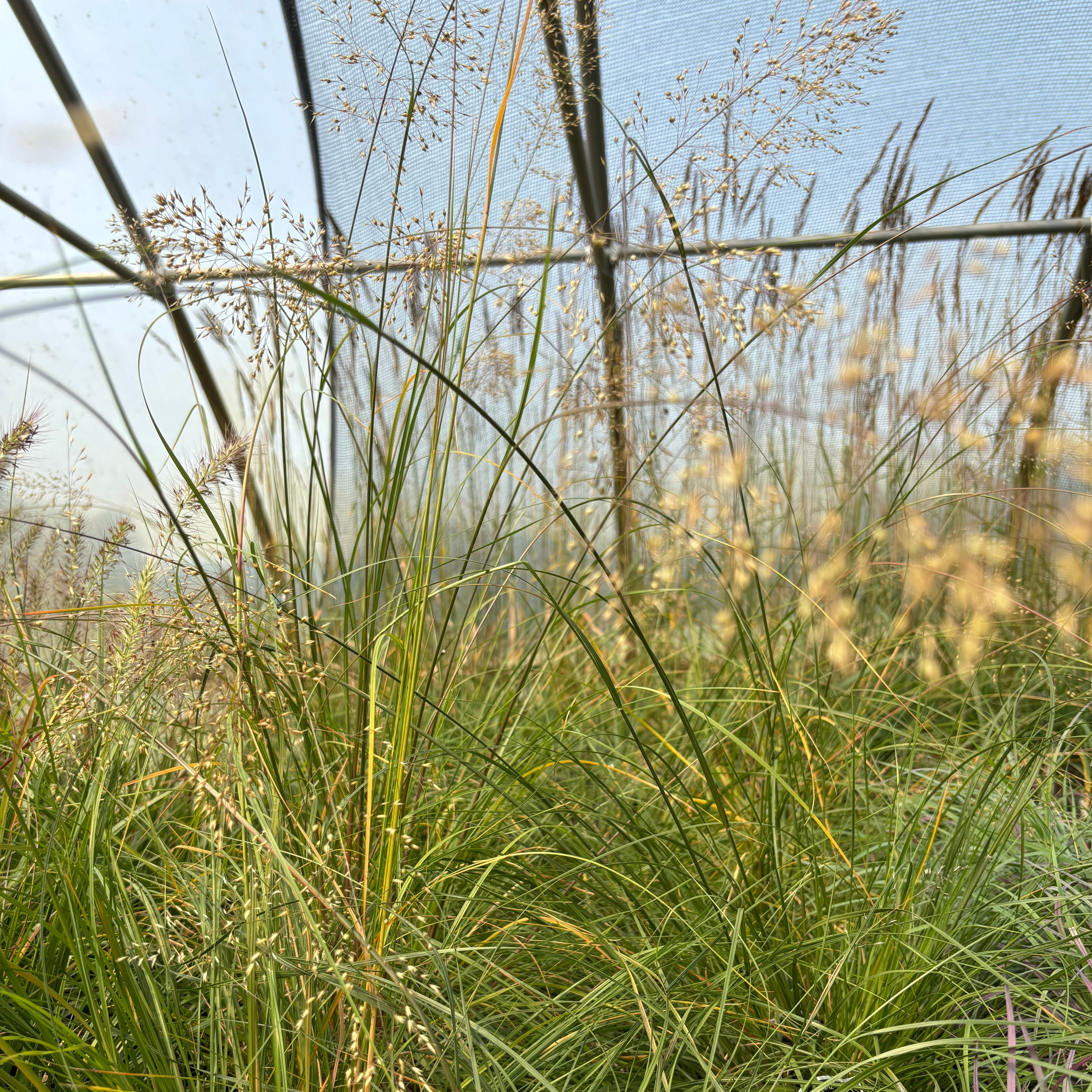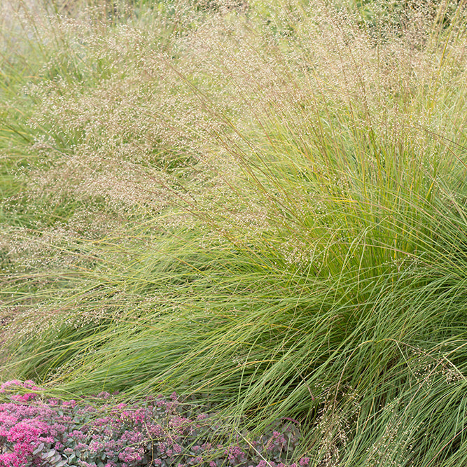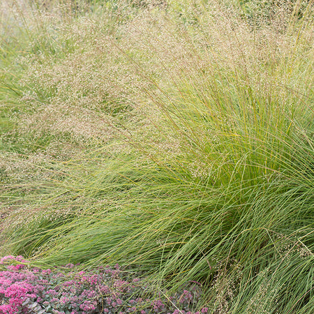 From late July through September, prairie dropseed produces one of its most distinctive features: delicate, open panicles that rise on slender stems 30 to 36 inches above the foliage mound. These airy inflorescences appear as a cloudy haze floating above the grass, with individual spikelets tinted in subtle shades of pink and brown. The flowers possess a remarkable characteristic rare among ornamental grasses – a noticeable fragrance variously described as reminiscent of coriander, buttered popcorn, hot wax, honey, or toasted sunflower seeds. This distinctive scent, which some find pleasantly aromatic and others consider pungent, adds an unexpected sensory dimension to late summer gardens and is particularly noticeable on warm afternoons when wind carries the fragrance through the planting. Following bloom, the grass produces small, smooth, hardened seeds technically classified as achenes rather than the typical caryopsis grains of most grasses. These seeds mature within tan hulls and eventually drop to the ground in autumn, giving rise to the common name "dropseed," though the plant generally does not self-sow aggressively in garden settings.