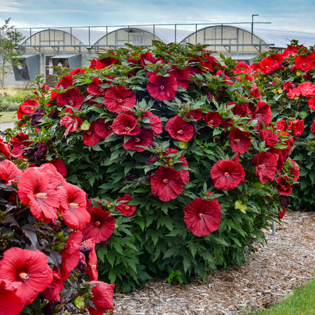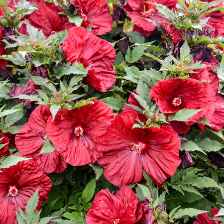We absolutely love this nativar rose mallow Hibiscus because it will give your yard a tropical appeal. In a single growing season it bursts into a 3-4’ tall and wide shrub. The green maple like leaves are gorgeous on their own, but soon you realize this is simply a backdrop for color. Large bright green buds emerge, then explode into 7-8” sports car red blooms. These blooms fade quickly but continue to emerge and stay with the plant from midsummer to fall. The symmetry, the shape and the size of these blooms… I mean look at the picture. Words are simply not enough. ‘Blackberry Merlot’ was selected because the blooms will cover the plant from ground-level up rather than just appearing at the top like some cultivars of this species. Makes a great specimen plant, or alternative to shrubs in the garden. Plant one or a few and you won’t be disappointed.