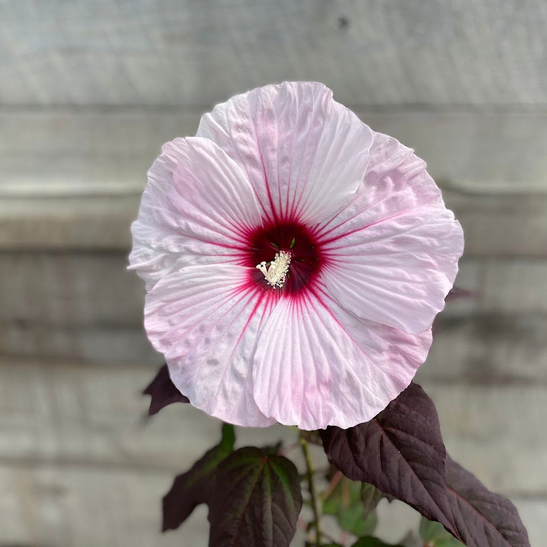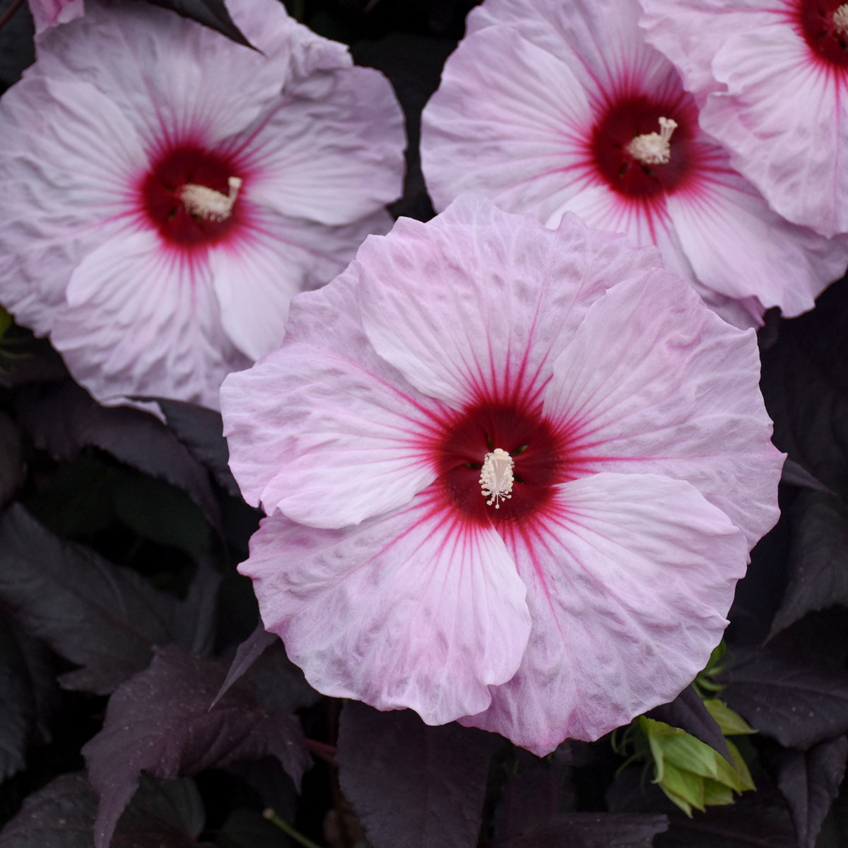 Hibiscus 'Dark Mystery' PP32036 commands attention with its striking combination of incredibly dark wine-purple foliage and massive white flowers that measure eight to nine inches across. This Walters Gardens introduction showcases large, ruffled blooms adorned with prominent cherry-red eyes and delicate dark pink veining that creates an elegant contrast against the pure white petals. The flowers display a characteristic hibiscus form with five broad, overlapping petals arranged in a slightly cupped shape around a protruding staminal column. The heart-shaped leaves emerge deep burgundy red in spring and mature to wine-purple with near-black tones that provide a dramatic backdrop throughout the growing season, making the foliage nearly as ornamental as the spectacular blooms.