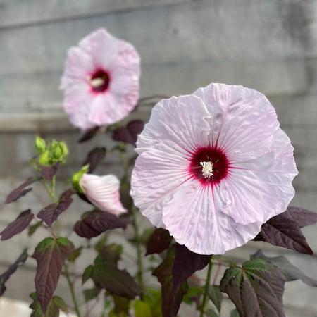 'Dark Mystery' demands full sun exposure of at least six hours daily for optimal flowering performance and foliage color development, though it tolerates partial shade with a minimum of four hours of direct sunlight. The cultivar requires consistently moist, well-drained soil enriched with organic matter and performs best in loamy conditions with slightly acidic to neutral pH. Unlike drought-tolerant perennials, this hardy hibiscus needs regular, deep watering throughout the growing season to produce the largest flowers and most lush foliage, and should never be allowed to wilt as moisture stress causes lower leaf loss, bud abortion, and reduced quality. The plant handles wet soils better than most perennials due to its native parentage including Hibiscus moscheutos, a wetland species, making it suitable for rain gardens and areas with high moisture. Gardeners should plant 'Dark Mystery' in locations protected from strong winds to prevent damage to the large blooms and provide good air circulation around plants to minimize fungal disease issues.