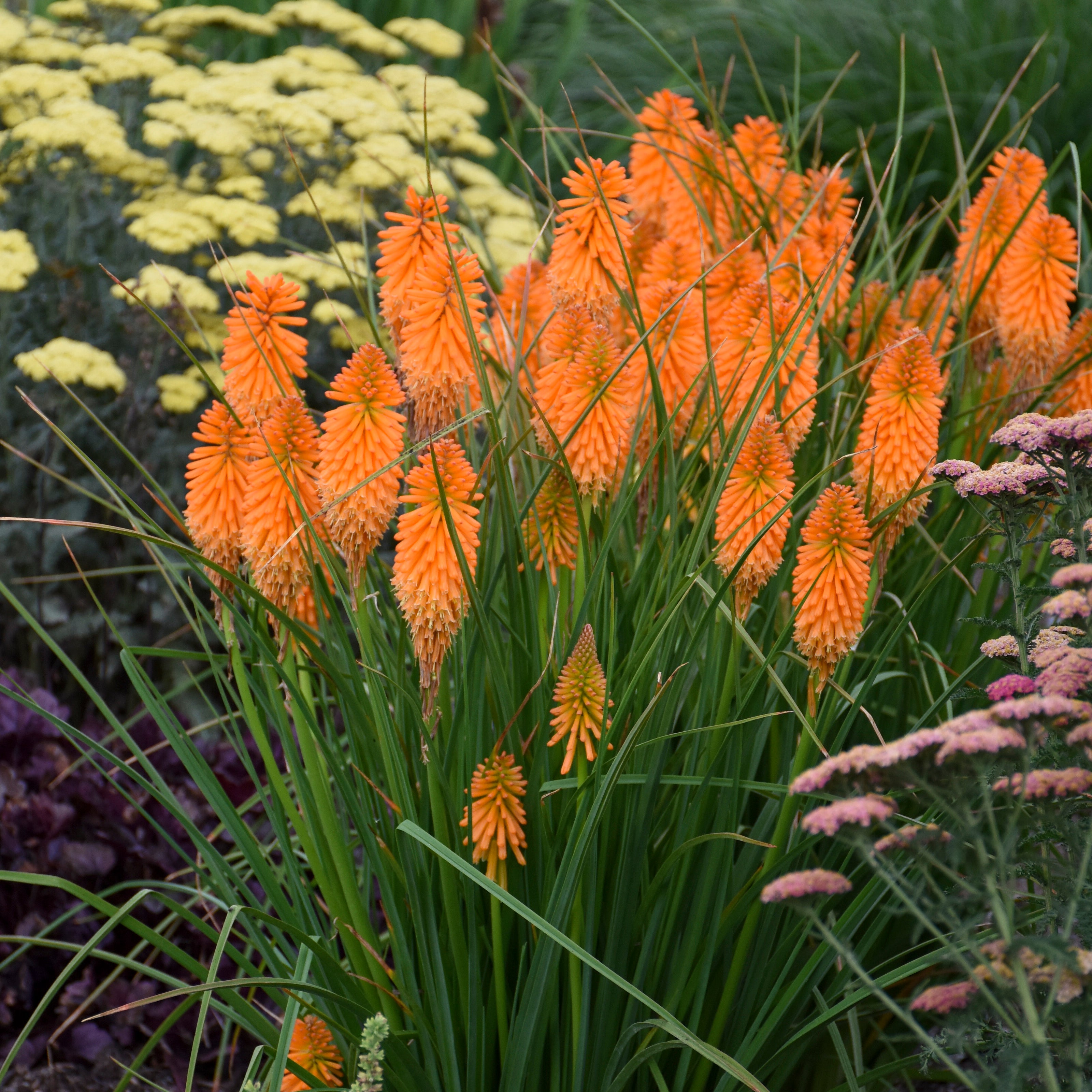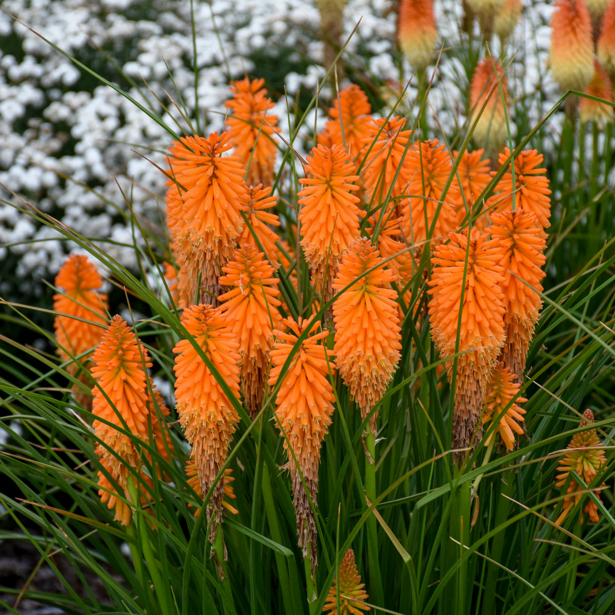 Commonly called Red Hot Poker or Torch Lily for their tall flower spikes. Kniphofia is a great choice if you are looking for something less traditional and want to add an exotic feel to your garden. Blooms last for many weeks starting in early summer before tapering off three to four weeks later. We like 'Orange Blaze" for the color and performance. Intense orange flowers fade to a creamy orange color in a gradient transition as flowers open. This transition starts and fades as flower mature, first at the base of the stem and moving upward. The downward facing flowers of Kniphofia are part of its unique character, but the wispy grass-like foliage is another element that brings eye-catching character to the garden.