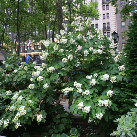 The oakleaf hydrangea - Hydrangea quercifolia - is a very versatile plant. This beautiful native shrub has a wonderful form and appearance that can be used in many landscape needs. If you are looking for a stand-alone shrub to highlight a garden or if you need multiple shrubs planted for a border the oakleaf hydrangea will perform. In the summer you will get large conical shaped flower clusters. These tiny flowers are a showy cream or white that will age to various pinks as summer turns to autumn. This shrub is also selected for its large oak shaped leaves that is unique to the hydrangea family. The oakleaf foliage has a nice dark green color that makes the white blooms pop through the summer and turns burgundy or dark purple in the fall. Oakleaf Hydrangea can be planted from shade to full sun, so for gardeners in need of a versatile and beautiful shrub it is an excellent choice.