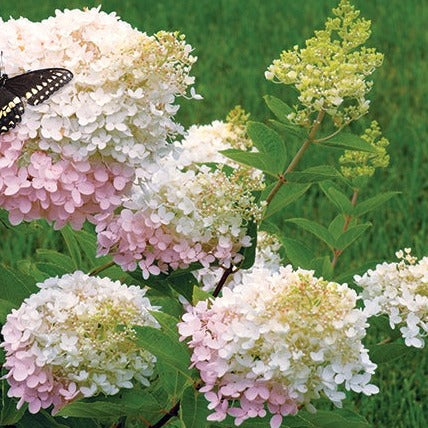 Pee Gee Hydrangea are full shrubs with large, white flower clusters that last through July and August. Each cluster is full of delicate blooms that give dimension especially as the white changes to a bright pink as the season goes on. These hydrangeas do not have the full droopy mop heads of many varieties, but instead carry smaller, but still significant clusters of flowers that provide a sense of elegance to your garden. These hydrangeas bloom on new wood, so they can be pruned back at any time during the year. We recommend right before new growth starts in the spring and often opt for a restorative technique only pruning back 1/3 of the existing growth.