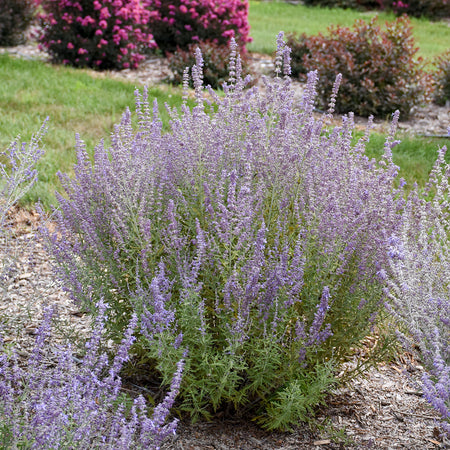 Russian sage is a widely used plant due to its beautiful texture, stately purple/blue flowers, and ease of care. Sage Advice is a taller cultivar with broader leaves and boasting the darkest purple flowers to date. Selected for its strong and upright stems, and excellent flower density/color. Airy blue/green foliage appears in mid-spring, growing quickly into As summer approaches thin stems reach up about a foot over the foliage producing dark purple flowers with dark purple calyxes. Perovskia has a long bloom period, and while some pedals may fall the purple calyxes will remain the entire growing season, providing season long color in an easy to care for package.
