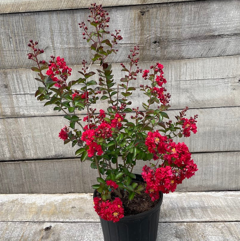 The blooms of a crape myrtle are a magnificent display that attract flocks of hummingbirds and butterflies through the summer months. These red crape myrtles produce 6” to 12” clusters of red flowers that can last for many weeks or even months. The leaves of crape myrtles are a unique glossy red/green and the growth rate of a crape myrtle is incredible, these trees can create shoots of new growth of more than a foot in just a few short weeks.