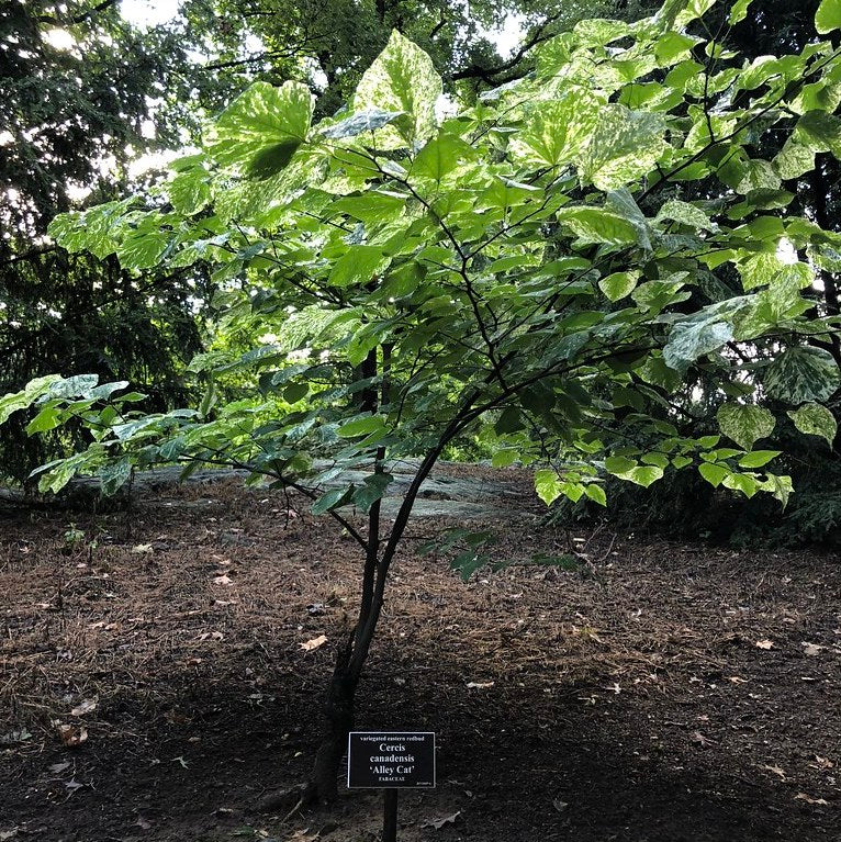 Alley Cat is a medium redbud that tops out around 20 feet at full maturity. It shares many of the characteristics of the common redbud with purple/pink spring blooms and general tolerance of many soil conditions and resistance to most disease. Placement is important. To ensure the best variegation we recommend no-less than 4-6 hours of sunlight, ideally with morning sun and afternoon shade. Ours is in full sun and does well, but in the mid-summer sun I think it would prefer a bit of respite from the sun's rays.