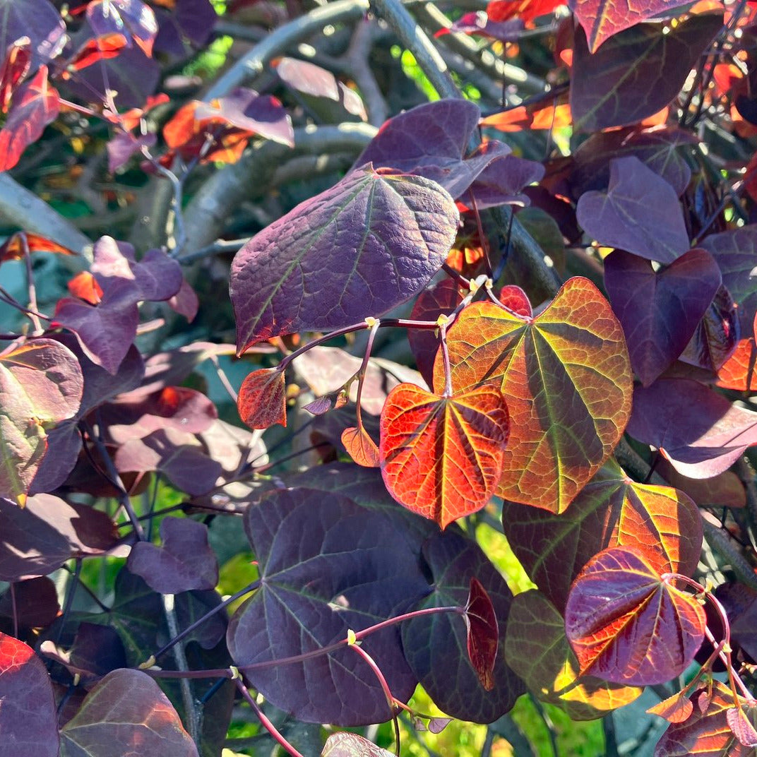 Ruby Falls is a purple redbud that will maintain purple/red leaves through the growing season. Like the forest pansy, the depth of color depends on the amount of sun that the leaves receive. In full sun the leaves will transition to a deep green with brighter green veins - The one pictured here is in full summer sun in August, hence the green shades. In full shade, they will remain more purple with green veins. Like all redbud trees, the ruby falls has captivating heart shaped leaves and small bright purple flower clusters in the early spring. Redbuds are hearty and disease resistant trees, and can tolerate a wide range of soil and light conditions.