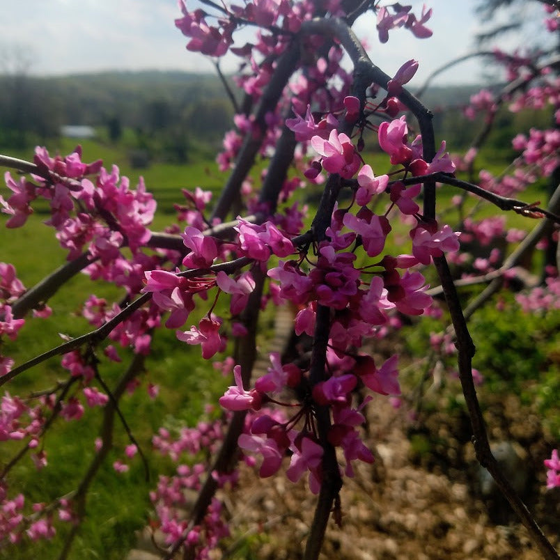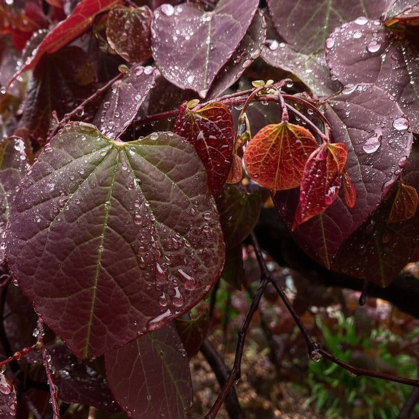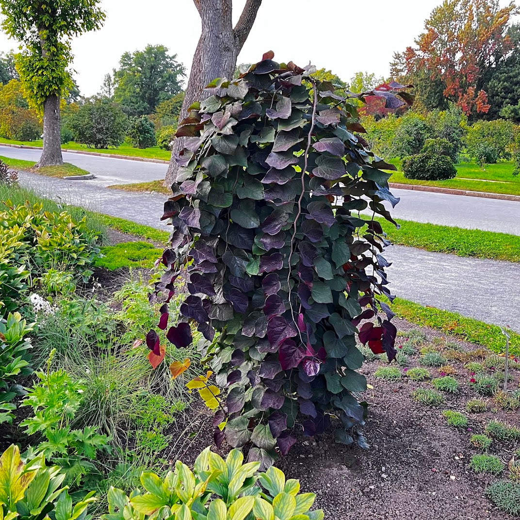 To say that Ruby Falls is a unique tree is perhaps an understatement. With large weeping heart shaped leaves, it is a tree that resembles a tiny monster as much as it does a tree. That's why, if you have a little bit of imagination and are willing to take a risk, this is a wonderful tree to use as the focus planting in a part of your garden. The human eye can't resist looking at it. Perhaps it triggers part of the brain that forces your attention, like a striking piece of art or some other captivating subject. If you want your yard or garden to beckon the eye and demand attention this is a great tree for the job all season long whether in branch, bloom, or leaf.
