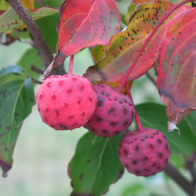 Large dark pink/red blooms are rare in a kousa dogwood and that's exactly what make Scarlet Fire special. The palm sized bloom bracts appear in the late spring to early summer and provide a dramatic statement during a time when most other trees are finished blooming. The blooms will first appear a lighter pink then darken to a deeper red over a period of 6-8 weeks. This two month long display ensures that the scarlet fire will make a dramatic statement and bring a long period of enjoyment to your home or garden. It's rare to find blooms like this, and it is even more rare to find beautiful qualities like this in a pest free low-maintenance tree. That's why we definitely recommend adding a Scarlet Fire Kousa to your yard.
