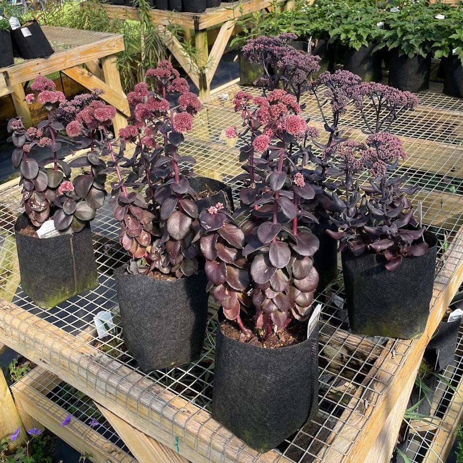 We really like this sedum because it is upright, ridiculously easy to grow, and makes a bold statement in the garden. Greenish purple leaves shoot up from the soil in early spring darkening into towering two foot tall shoots of night. Starting in the summer pink to mauve flowers emerge creating cloudbursts of color held aloft above the darker plant. This depth of color is not something that is easily or often found in the garden and used in the right setting it will create a dramatic effect. This tall upright sedum provides a substitute for shrubs in the garden. Spent heads continue to provide interest and food for birds through the winter. Seed heads can be removed in early spring to make way for the next season's dark plum colored growth.