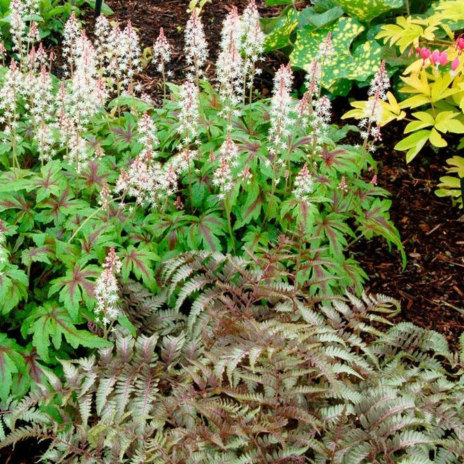 This shade loving native perennial has jagged multi-lobed leaves that will give any Japanese maple a run for it's money. The outside of each leaf is a vivid green, while the inside is a spectrum of reds. The compact nature of this plant makes it great as a ground cover under taller trees and shrubs, it can be used anywhere you might consider hostas, ferns, or its cousin the coral bell. In the mid to late spring the tiarella adds to its appeal as panicles of white and pink flower rise up from the plant creating an intoxicating display of color and texture.