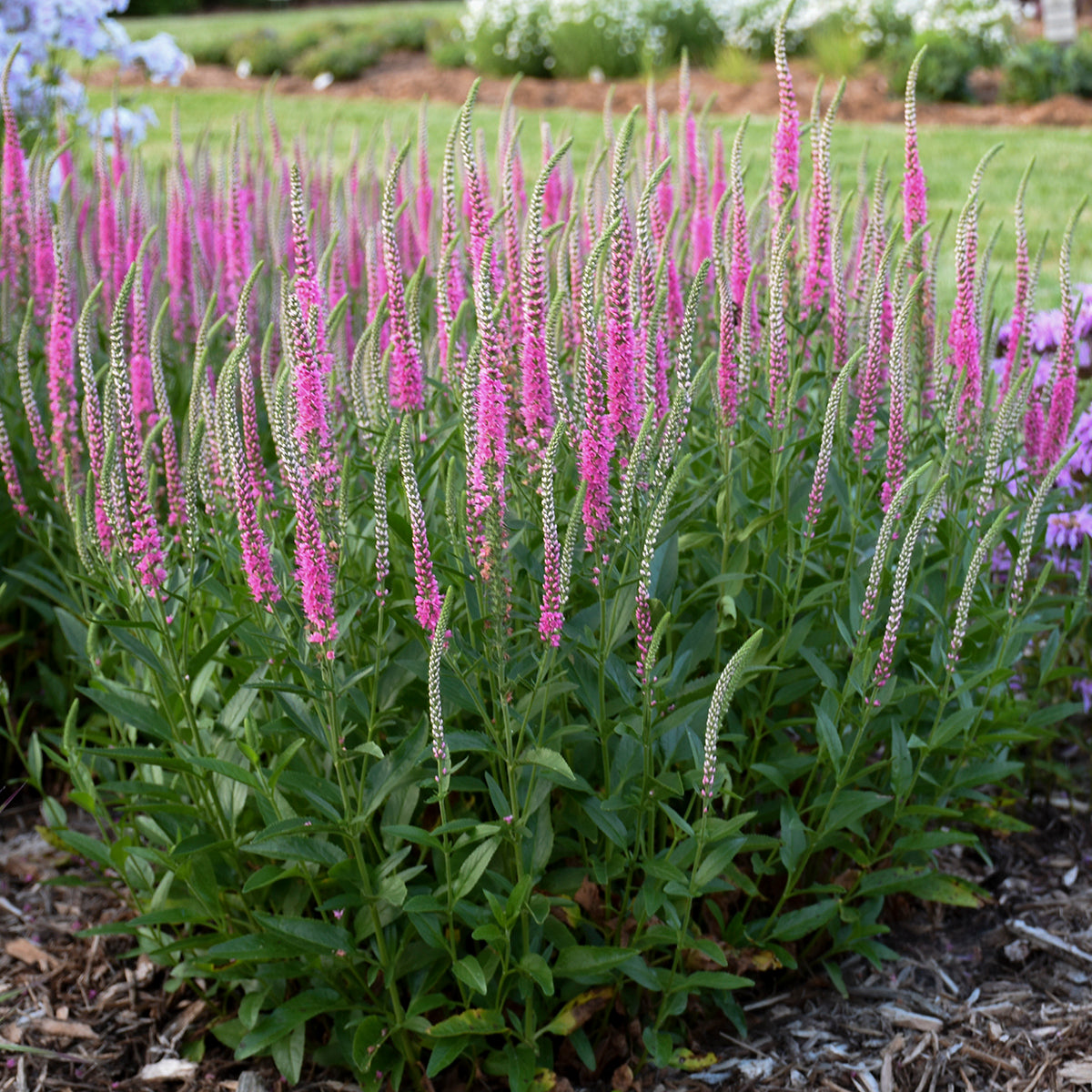 Some plants demand to be seen and this picturesque veronica stands out from the crowd. The flowers emerge as green spikes and transition to a pretty pink. They are reminiscent of a high quality painting and the stand out in the garden thanks to their beauty and vertical quality. The bottle brush like spikes proliferate during a long bloom period from mid to late summer. You'll find that pollinators flock to the flowers of veronica, which are wonderful additions to a cut flower arrangement. Veronica is an easy to grow perennial that can tolerate part shade and makes a wonderful mid-level flower for a border garden, patio container or raised bed. The green and purple shades pair well with warm oranges and yellows or cooler blues and greens. If you are looking for an easy to care for mid-sized plant that will bring multiple shades of pink and green to your garden, then Proven Winners 'Perfectly Picasso' is a perfectly good choice.