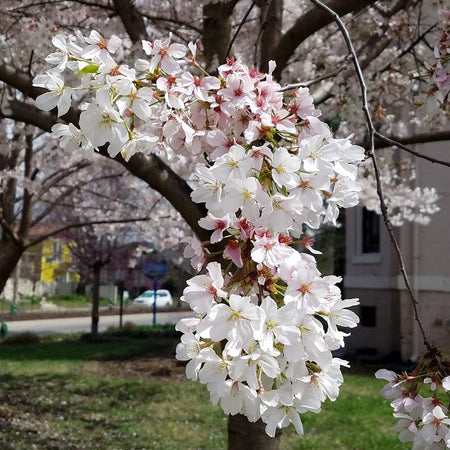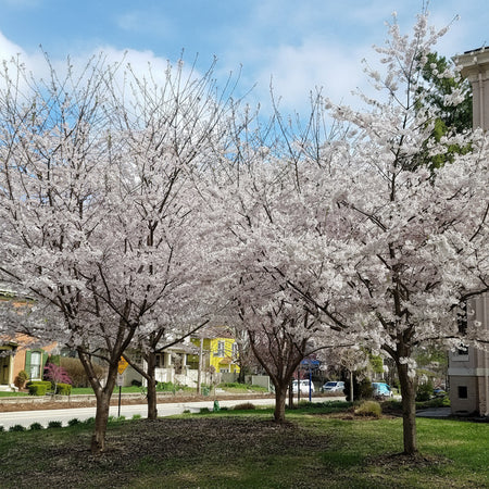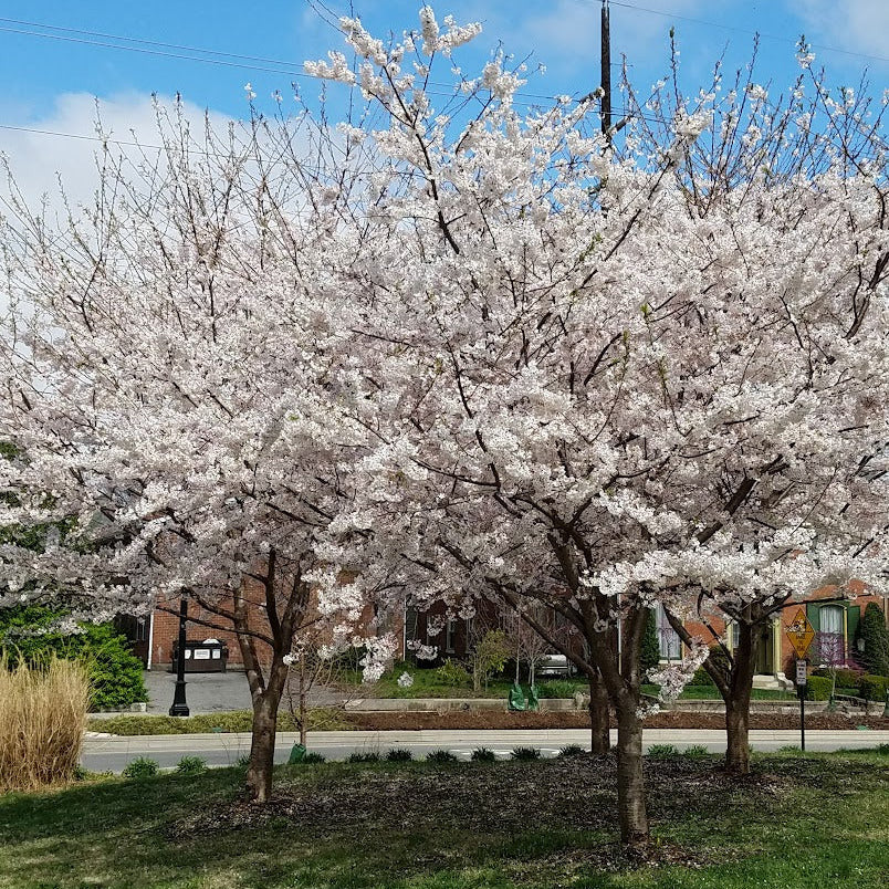 The Yoshino Cherry delivers a profuse and spectacular early spring display that few flowering trees can match—thousands of fragrant white to pale pink flowers emerge along bare branches in clouds of delicate blooms, creating what many consider the most breathtaking moment in the ornamental tree calendar. The almond-scented flowers appear in 3 to 6-flowered clusters before or simultaneous to the emergence of foliage, typically blooming for 2 to 3 weeks in late March to early April. This graceful tree typically grows 30 to 40 feet tall with a spreading, broad-rounded, open crown that provides elegant horizontal branching—ideal for planting along walks, over patios, or as a specimen tree. Dark green serrate leaves emerge as flowers fade, turning yellow with bronze tints in fall. Small black cherries follow the flowers, bitter to humans but loved by birds. The smooth bark marked with prominent horizontal lenticels adds winter interest.